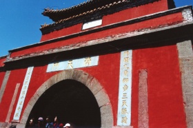 红门宫 位于“孔子登临处”石坊北。其地东临中溪,西依大藏岭,因岭上有丹壁如门而得名。红门宫创建无考,明天启六年(1626年)重修。它以盘路为界,分为东西两院,并以飞云阁跨路相连,拱形门洞上题“红门”两大字。西院为道观,宫门额题“红门宫”,祀泰山女神,为碧霞元君中庙。东院为“弥勒院”,供奉弥勒佛。